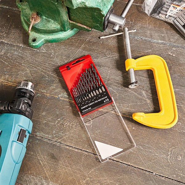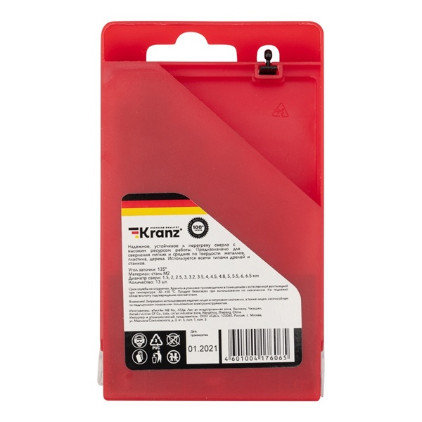 Набор сверл по металлу бренда Kranz состоит из 13 спиральных сверл с диаметром от 1,5 до 6,5 мм. Они изготовлены из быстрорежущей стали марки HSS P6M5. Твердость оснастки составляет 62-64 HRC. Угол заточки сверл равен 118 градусов. Надежные, устойчивые к перегреву сверла с хорошим ресурсом работы используются со всеми типами дрелей и станков. Они предназначены для сверления мягких и средних по твердости металлов, а также пластика и дерева. Диаметр сверл, входящих в комплект следующий: 1.5, 2, 2.5, 3, 3.2, 3.5, 4, 4.5, 4.8, 5, 5.5, 6, 6.5 мм. Они имеют цилиндрический хвостовик.