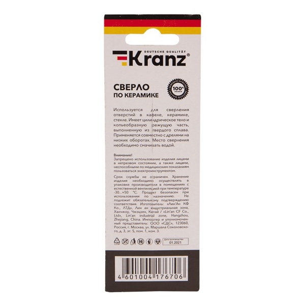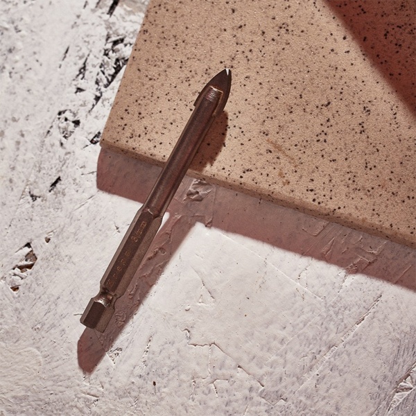 Для сверления отверстий в стекле, керамической и кафельной плитке требуется особый подход, связанный с подбором соответствующего инструмента. Ввиду хрупкости такого материала необходимы специальные сверла по керамике и стеклу с особой формой и углом заточки. Известная компания Kranz представляет шестигранное сверло по стеклу и кафелю с диаметром 8 мм. Оно имеет цилиндрическое тело и копьеобразную режущую часть и шестигранный хвостовик. Материалом изготовления сверла служит твердый сплав из стали HSS. Высококачественная заточка режущих кромок улучшает прохождение материала, тем самым снижая вероятность образования трещин и сколов во время сверления, а специальная проточка хвостовика позволяет использовать быстросъемные адаптеры. Сверло используется совместно с шуруповертами и дрелями на низких оборотах. Главным достоинством такого изделия является длительный срок службы. Важно учесть, что при сверлении керамогранита срок службы такого сверла сильно сокращается. Его профиль и угол заточки рассчитан исключительно на стекло и керамику. При попытке сверления кирпича или бетона оно быстро выходит из строя.