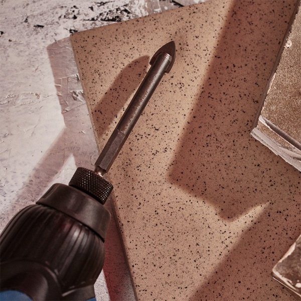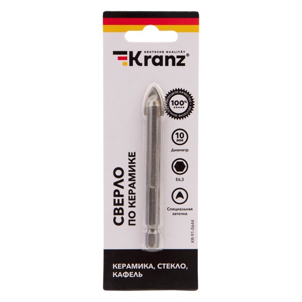 Торговая марка Kranz представляет специальный инструмент для сверления отверстий в стекле, керамической и кафельной плитке. Это копьеобразное сверло с диаметром 10 мм и шестигранным хвостовиком. Шестигранный хвостовик пригоден для использования с шуруповертами. Вышеуказанный материал имеет тонкую и хрупкую структуру, поэтому требует особого подхода. Сверло по кафелю и стеклу имеет специальную форму и угол заточки. Внешне оно имеет цилиндрическое тело и копьеобразную режущую часть. Высококачественная заточка режущих кромок улучшает прохождение материала, тем самым снижая вероятность образования трещин и сколов во время сверления. Специальная проточка хвостовика позволяет использовать быстросъемные адаптеры. Материалом изготовления выступает твердый сплав – сталь HSS. Сверло используется совместно с электроинструментом на небольших оборотах. Одним из преимуществ такого инструмента является длительный срок службы, который зависит от области его применения. Например, при сверлении керамогранита срок службы такого сверла сильно сокращается. Его профиль и угол заточки рассчитаны исключительно на стекло и керамику. При попытке сверления кирпича или бетона сверло также быстро выходит из строя.