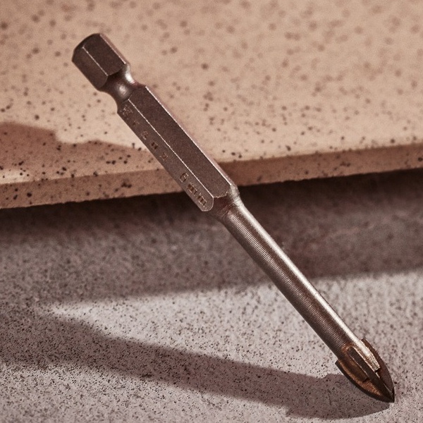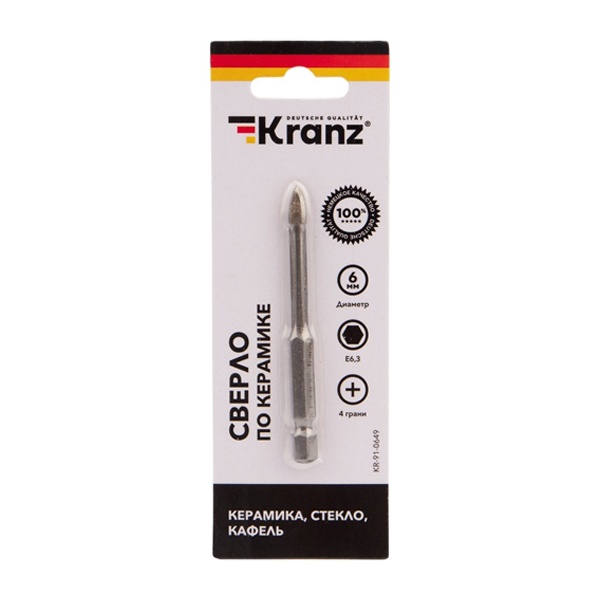 Для сверления отверстий в стекле, керамической и кафельной плитке требуется особый подход, связанный с подбором соответствующего инструмента. Ввиду хрупкости такого материала необходимы специальные сверла по керамике и стеклу с особой формой и углом заточки. Известная компания Kranz представляет шестигранное сверло по стеклу и кафелю с диаметром 6 мм. Оно имеет цилиндрическое тело, 4 грани, копьеобразную режущую часть и шестигранный хвостовик. Материалом изготовления сверла служит твердый сплав из стали HSS. Высококачественная заточка режущих кромок улучшает прохождение материала, тем самым снижая вероятность образования трещин и сколов во время сверления, а специальная проточка хвостовика позволяет использовать быстросъемные адаптеры. Сверло используется совместно с шуруповертами и дрелями на низких оборотах. Главным достоинством такого изделия является длительный срок службы. Важно учесть, что при сверлении керамогранита срок службы такого сверла сильно сокращается. Его профиль и угол заточки рассчитан исключительно на стекло и керамику. При попытке сверления кирпича или бетона оно быстро выходит из строя.