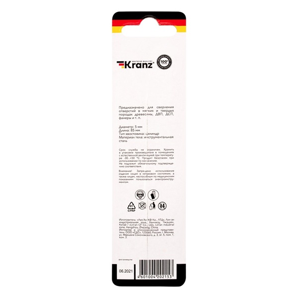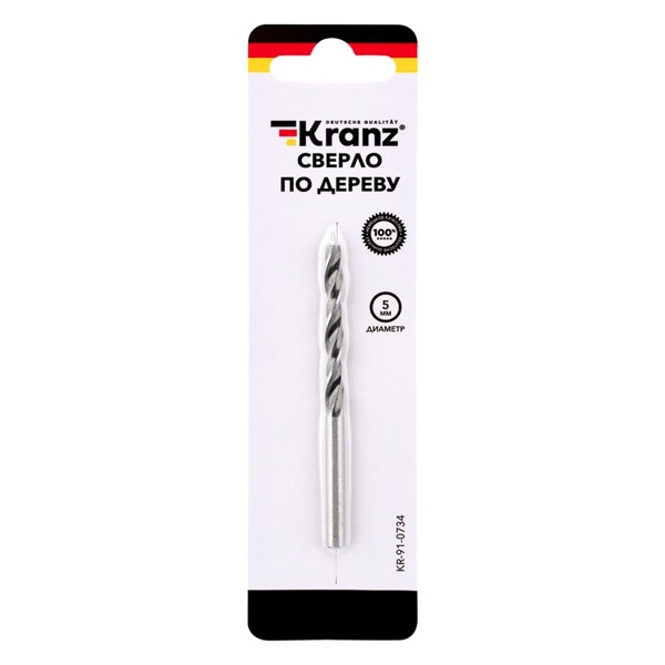 Для сверления отверстий в мягких и твердых породах древесины, ДВП, ДСП и фанере применяют сверло по дереву. Известная компания Kranz представляет такой инструмент винтового типа с диаметром 5 мм и длиной 85 мм. Сверло представляет собой тонкий инструмент спирального вида с заостренным концом. Оно сделано из инструментальной стали и оснащено цилиндрическим хвостовиком, который обеспечивает надежную фиксацию оснастки в патроне во время работы. Главным достоинством такого изделия является длительный срок службы. Важно использовать его по назначению, чтобы оно преждевременно не вышло из строя. Сверление древесины при помощи такого инструмента позволяет получать точные и аккуратные отверстия с ровными краями и гладкой поверхностью внутренних стенок. Рекомендуется хранить инструмент в упаковке производителя в помещениях с естественной вентиляцией при температуре от -30 до +50 градусов Цельсия. Если сверло заглублять в обрабатываемый материал с небольшой скоростью, то отпадет необходимость в частом извлечении инструмента из создаваемого отверстия для удаления скопившейся стружки.