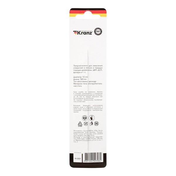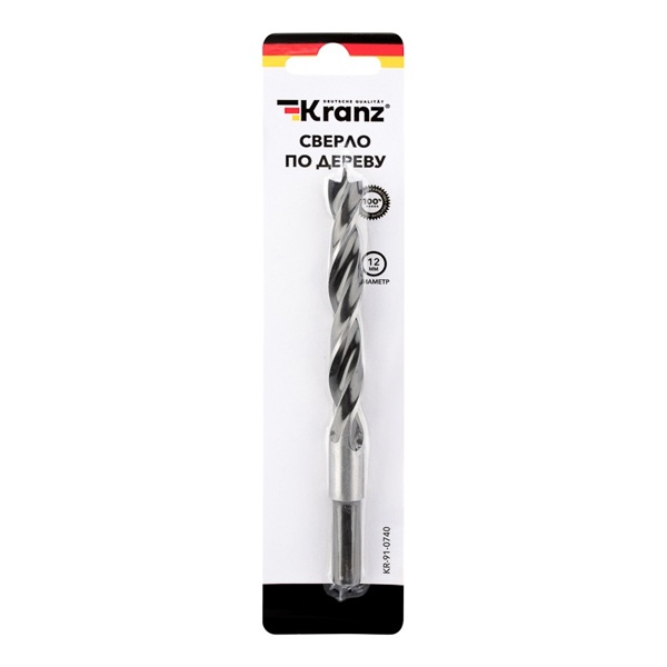 Для сверления отверстий в мягких и твердых породах древесины, ДВП, ДСП и фанере применяют сверло по дереву. Известная компания Kranz представляет такой инструмент винтового типа с диаметром 12 мм и длиной 150 мм. Сверло представляет собой тонкий инструмент спирального вида с заостренным концом. Оно сделано из инструментальной стали и оснащено цилиндрическим хвостовиком, который обеспечивает надежную фиксацию оснастки в патроне во время работы. Главным достоинством такого изделия является длительный срок службы. Важно использовать его по назначению, чтобы оно преждевременно не вышло из строя. Сверление древесины при помощи такого инструмента позволяет получать точные и аккуратные отверстия с ровными краями и гладкой поверхностью внутренних стенок. Рекомендуется хранить инструмент в упаковке производителя в помещениях с естественной вентиляцией при температуре от -30 до +50 градусов Цельсия. Если сверло заглублять в обрабатываемый материал с небольшой скоростью, то отпадет необходимость в частом извлечении инструмента из создаваемого отверстия для удаления скопившейся стружки.