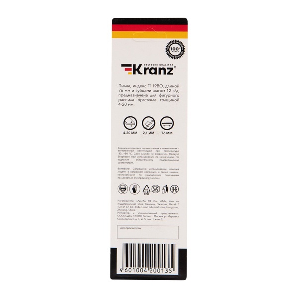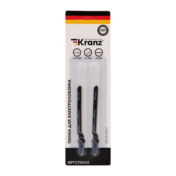 Пилка для электролобзика от компании Kranz предназначена для фигурного распила заготовок из оргстекла, пластика, а также дерева разной твердости и плитных материалов: ДСП, ДВП, МДФ, ЛДСП, фанеры и ОСБ. Это улучшенный тип оснастки и его прямое назначение – обеспечить фигурный рез материала. Он обладает улучшенной заточкой зубьев и отлично подходит для всех марок электролобзиков с креплением для Т-образного хвостовика. Полотно надежно фиксируется в патроне. Усовершенствованная закалка токами высокой частоты увеличивает твердость зубьев и обеспечивает высокий ресурс работы. Пилка выполнена из высокоуглеродистой стали HCS. Толщина резки допускает диапазон от 4 до 20 мм. Для удобства выбора подходящей модели полотна необходимо обращать внимание на информативное обозначение, которое предусмотрел производитель. Данная модель T119BО расшифровывается следующим образом: пильное полотно с хвостовиком самой распространенной Т-образной формы. Цвет хвостовика серый – это свидетельствует о назначении пилки – для дерева, но также подходит и для оргстекла. Дополнительно на полотне указано for wood – для дерева. Цифры 119 отвечают за длину оснастки и форму зубьев. Длина пилки составляет 76 мм и относится к короткому типу (1), зубья – фрезерованные (19). Буква после цифр В соответствует среднему размеру зубьев. Буква О значит, что у полотна узкая спинка, за счет чего удается добиться очень аккуратного пропила. Оснастка имеет 12 зубьев на дюйм. Такой режущий инструмент необходимо использовать только по назначению, тогда он обеспечит качественное и быстрое выполнение операций и поможет продлить рабочий ресурс лобзика. В упаковку входит 2 штуки.