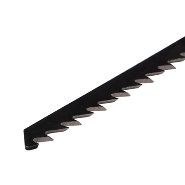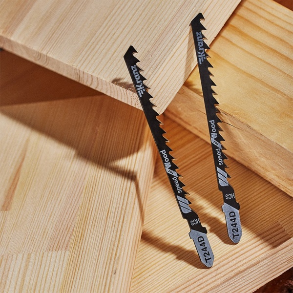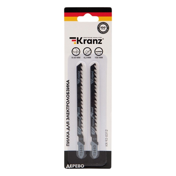 Пилка для электролобзика от компании Kranz предназначена для фигурного реза заготовок из дерева разной твердости, а также плитных материалов: ДСП, ДВП, МДФ, ЛДСП, фанеры и ОСБ. Это усовершенствованный тип оснастки, толщина реза которого имеет диапазон от 8 до 60 мм. Пильное полотно сделано из высокоуглеродистой стали HCS, что идеально подходит для древесины и ее производных любой твердости. Для удобства выбора подходящей модели полотна необходимо обращать внимание на его маркировку, которая предусмотрена производителем. Данная модель T244D расшифровывается следующим образом: пильное полотно с хвостовиком самой распространенной Т-образной формы. Цвет хвостовика серый – это свидетельствует о назначении пилки – для древесины. Дополнительно на полотне указано назначение: for wood – для дерева. Цифры 2 и 44 отвечают за длину оснастки и форму зубьев. Длина пилки составляет 100 мм и относится к среднему типу (2), зубья – большие разведенные для быстрого грубого распила (44). Буква после цифр D соответствует редкому шагу зубьев с расстоянием 4-5 мм. У данного полотна 6 зубьев на дюйм. Такой режущий инструмент необходимо использовать только по назначению, тогда он обеспечит качественное и быстрое выполнение операций и поможет продлить рабочий ресурс лобзика. Он надежно фиксируется в патроне, а улучшенная закалка токами высокой частоты увеличивает твердость зубьев и обеспечивает высокий ресурс работы. В упаковку входит 2 полотна.