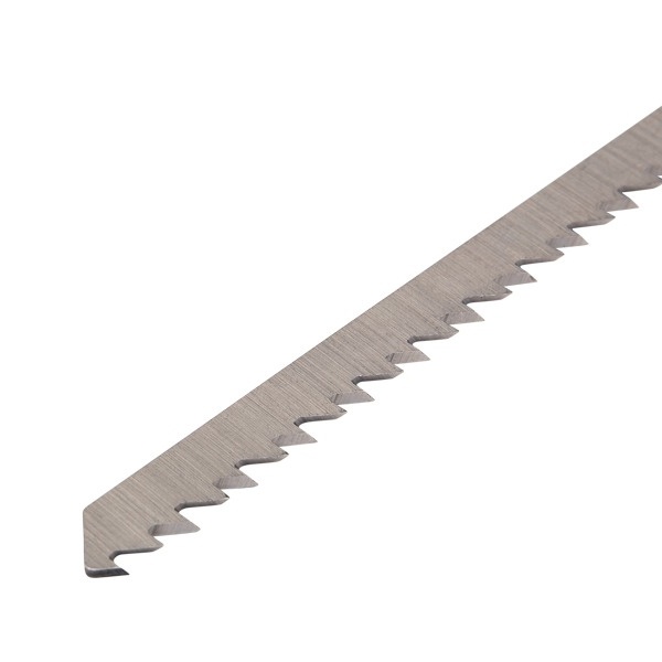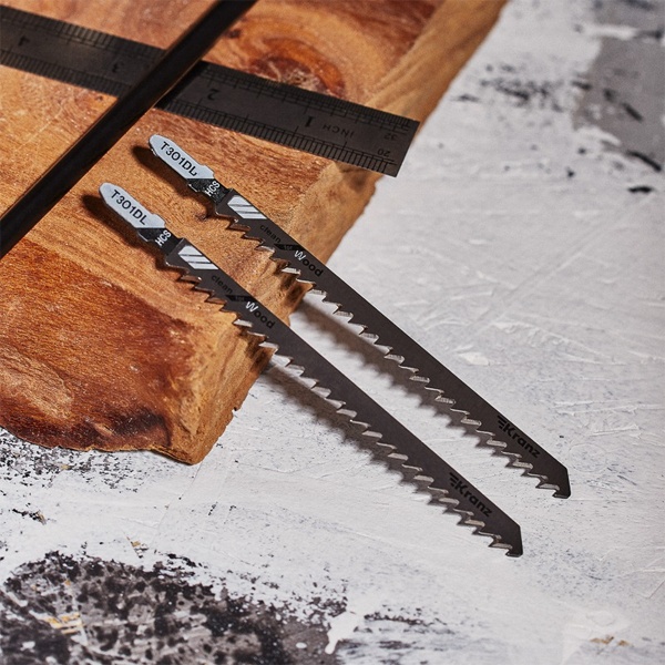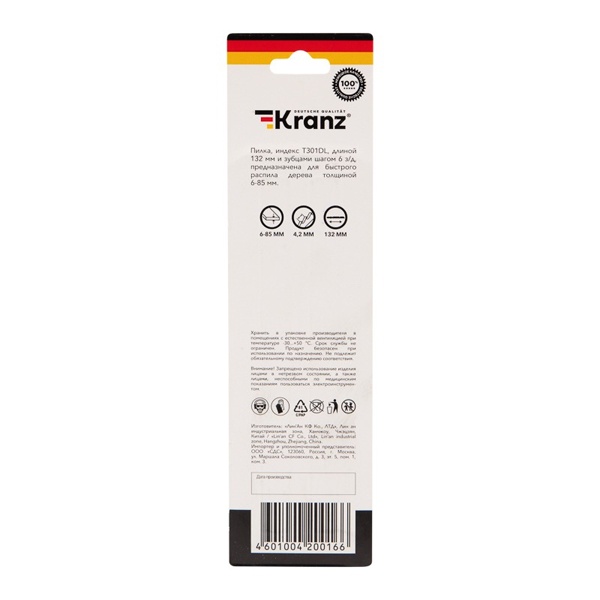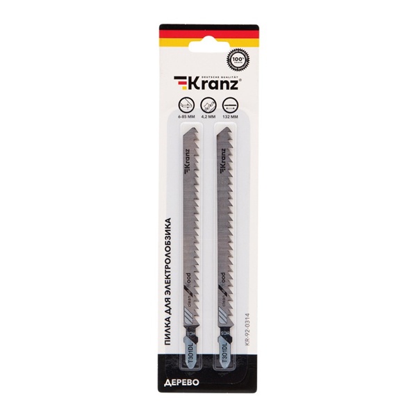 Пилка для электролобзика от компании Kranz предназначена для быстрого и ровного распила заготовок из дерева разной твердости, а также плитных материалов: ДСП, ДВП, МДФ, ЛДСП, фанеры и ОСБ. Это усовершенствованный тип оснастки, толщина реза которого имеет диапазон от 6 до 85 мм. Пильное полотно сделано из высокоуглеродистой стали HCS, что идеально подходит для древесины и ее производных любой твердости. Для удобства выбора подходящей модели полотна необходимо обращать внимание на его маркировку, которая предусмотрена производителем. Данная модель T301DL расшифровывается следующим образом: пильное полотно с хвостовиком самой распространенной Т-образной формы. Цвет хвостовика серый – это свидетельствует о назначении пилки – для древесины. Дополнительно на полотне указано назначение: for wood – для дерева. Цифры 3 и 01 отвечают за длину оснастки, шаг и форму зубьев. Длина пилки составляет 132 мм и относится к длинному типу (3), зубья – шлифованные, неразведенные. Чаще всего такая оснастка используется для получения чистого реза (01). Буква после цифр D соответствует редкому шагу зубьев с расстоянием 4-5 мм. У данного полотна 6 зубьев на дюйм. Следующая буква L отвечает за дополнительные параметры полотна: для быстрых, тонких пропилов. Полотно надежно фиксируется в патроне, а улучшенная закалка токами высокой частоты увеличивает твердость зубьев и обеспечивает высокий ресурс работы. В упаковку входит 2 пилки.