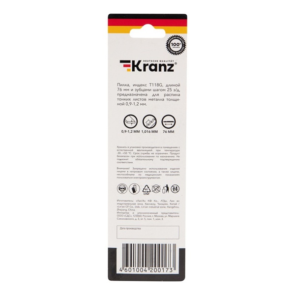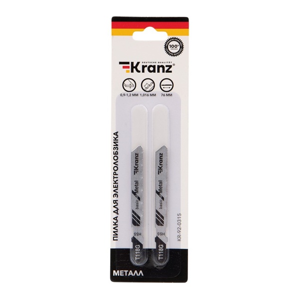 Пилка для электролобзика торговой компании Kranz предназначена для распила тонких металлических листов. Она обладает улучшенной заточкой зубьев и отлично подходит для всех марок электролобзиков с креплением для Т-образного хвостовика. Полотно надежно фиксируется в патроне. Усовершенствованная закалка токами высокой частоты увеличивает твердость зубьев и обеспечивает высокий ресурс работы. Пилка сделана из инструментальной быстрорежущей стали HSS, идеально подходящей для работы с металлом. Толщина резки металла допускает диапазон от 0,9 до 1,2 мм. Для удобства выбора подходящей модели необходимо обращать внимание на ее маркировку, которую предусмотрел производитель. Данная модель T118G расшифровывается следующим образом: пильное полотно с хвостовиком самой распространенной Т-образной формы. Цвет хвостовика черный – это свидетельствует о назначении пилки – для металла. Дополнительно на полотне указано for metal – для металла. Цифры 1 и 18 отвечают за длину оснастки и форму зубьев. Длина пилки составляет 76 мм и относится к короткому типу (1), зубья – волнистые фрезерованные (18). Инструмент с такой разводкой обеспечивает чистый рез по прямой. Буква после цифр G соответствует шагу зубьев менее 1 мм. Оснастка имеет 25 зубьев на дюйм. Такой режущий инструмент необходимо использовать только по назначению, тогда он обеспечит качественное и быстрое выполнение операций и поможет продлить рабочий ресурс лобзика. В упаковку входит 2 единицы.