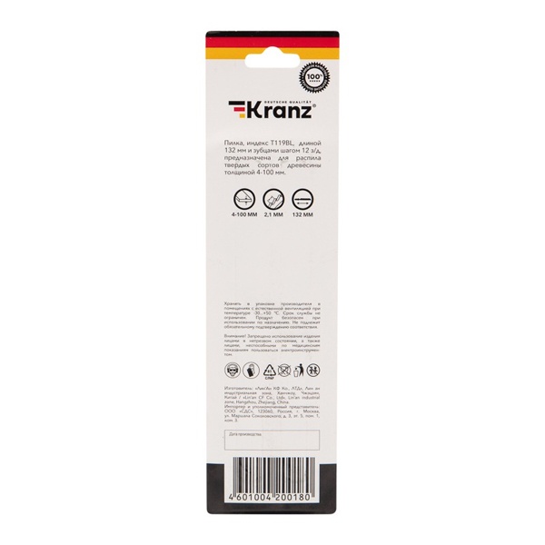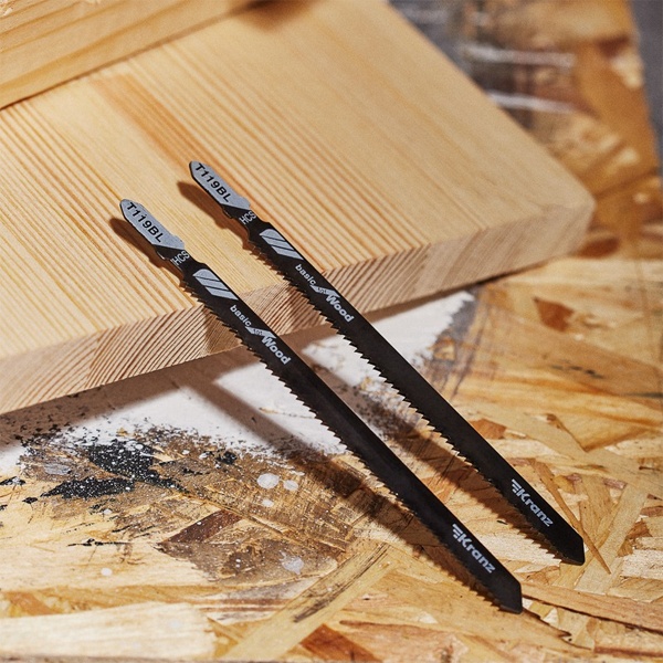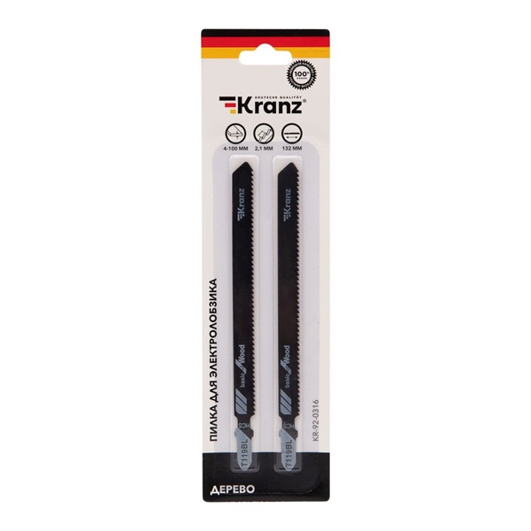 Пилка для электролобзика от компании Kranz предназначена для распила твердых сортов древесины, а также пластика и плитных материалов: ДСП, ДВП, МДФ, ЛДСП, фанеры и ОСБ. Это усовершенствованный тип оснастки, толщина реза которого имеет диапазон от 4 до 100 мм. Пильное полотно сделано из высокоуглеродистой стали HCS, что идеально подходит для древесины и ее производных любой твердости. Для удобства выбора подходящей модели полотна необходимо обращать внимание на его маркировку, которая предусмотрена производителем. Данная модель T119BL расшифровывается следующим образом: пильное полотно с хвостовиком самой распространенной Т-образной формы. Цвет хвостовика серый – это свидетельствует о назначении пилки – для древесины. Дополнительно на полотне указано назначение: for wood – для дерева. Цифры 1 и 19 отвечают за длину оснастки, шаг и форму зубьев. Длина пилки составляет 132 мм и относится к короткому типу (1), зубья – фрезерованные (19). Буква после цифр B соответствует шагу зубьев с расстоянием 2-3 мм. У данного полотна 12 зубьев на дюйм. Следующая буква L отвечает за дополнительные параметры полотна: оснастка пригодна для быстрых, тонких пропилов. Полотно надежно фиксируется в патроне, а улучшенная закалка токами высокой частоты увеличивает твердость зубьев и обеспечивает высокий ресурс работы. В упаковку входит 2 пилки.