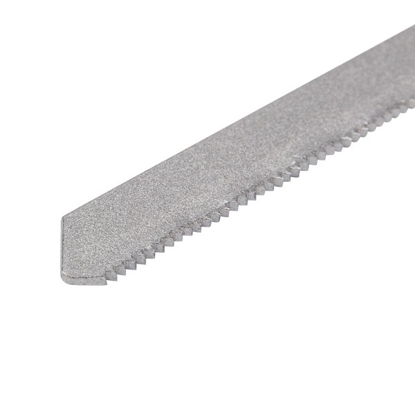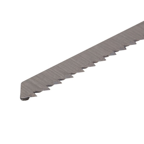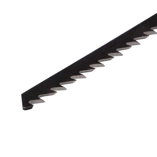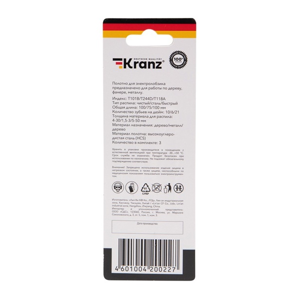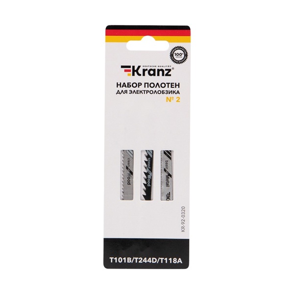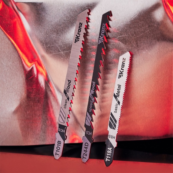 Набор пильных полотен для электролобзика № 2 торговой марки Kranz предназначен для распила заготовок из металла и дерева разной твердости, а также плитных материалов: ДСП, ДВП, МДФ, ЛДСП, фанеры и ОСБ. Он включает в себя 3 разные пилки с индексами: T101B, T118А и Т244D, которые обеспечивают чистый, и быстрый рез материала. Пильные полотна для работы с деревом сделаны из высокоуглеродистой стали HCS, а полотно для металла – из инструментальной быстрорежущей стали HSS. Для удобства выбора подходящей модели полотна необходимо обращать внимание на его маркировку, которая предусмотрена производителем. Вся оснастка оснащена хвостовиками самой распространенной Т-образной формы, относится к короткому и среднему типу с длиной 1 полотна – 75 мм и 2 полотен по 100 мм. Они надежно фиксируются в патроне, а улучшенная закалка токами высокой частоты увеличивает твердость зубьев и обеспечивает высокий ресурс работы. Если цвет хвостовика серый – это свидетельствует о назначении пилки – для древесины. Дополнительно указано назначение в виде надписи for wood – для дерева. Если цвет хвостовика черный – это означает, что полотно предназначено для распила металла. Особенностью модели T101B являются шлифованные, неразведенные зубья для получения чистого реза древесины. Толщина материала для резки – 4-30 мм, шаг зубьев – 2-3 мм (10 зубьев на дюйм). Пилка T118А для металла обеспечивает распил волнистыми фрезерованными зубьями с шагом 1,5-2 мм (21 зуб на дюйм). Толщина материала для распила 1,5-3 мм. Полотно Т244D с большим разведенным зубом позволяет получить быстрый грубый рез дерева с допустимой толщиной материала 5-50 мм, шаг зубьев составляет 4-5 мм (12 зубьев на дюйм).