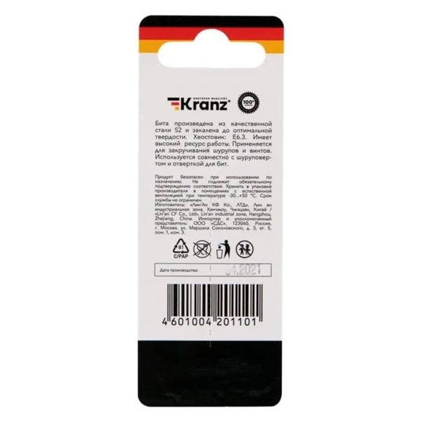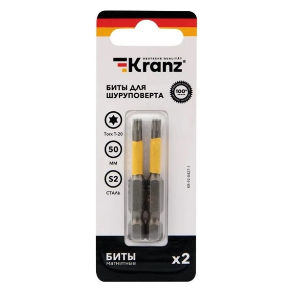 Универсальная удлиненная бита Torx торговой марки Kranz предназначена для винтов Torx размера TX 20. Такой вид насадки имеет форму звезды, ее конструктивная особенность позволяет улучшить сцепляемость с поверхностью крепежного изделия и снизить вероятность соскальзывания приспособления, так как нагрузка распределяется сразу на 6 граней. Бита изготовлена из высококачественной стали и обладает необходимым значением твердости и прочности. Ее длина составляет 50 мм, Насадка имеет универсальное применение и подходит для использования с шуруповертами и отвертками. Ее привод соответствует шестиграннику 1/4 дюйма. Насадка закалена до вязкой твердости, это препятствует преждевременному разрушению ведомого наконечника. Она идеально подходит для тяжелых случаев завинчивания и применяется в машиностроительной области и в производстве бытовой техники для закручивания крепежных элементов с соответствующей формой головки.