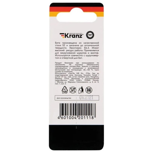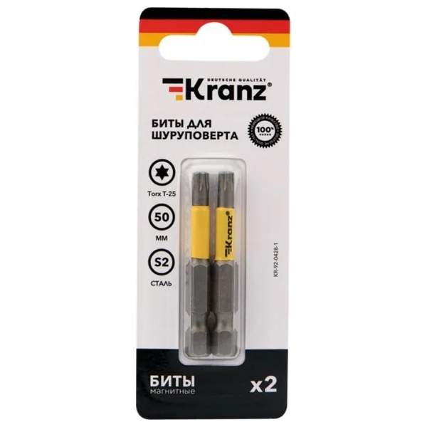 Универсальная удлиненная бита Torx торговой марки Kranz предназначена для винтов Torx размера TX 25. Такой вид насадки имеет форму звезды, ее конструктивная особенность позволяет улучшить сцепляемость с поверхностью крепежного изделия и снизить вероятность соскальзывания приспособления, так как нагрузка распределяется сразу на 6 граней. Бита изготовлена из высококачественной стали и обладает необходимым значением твердости и прочности. Ее длина составляет 50 мм, Насадка имеет универсальное применение и подходит для использования с шуруповертами и отвертками. Ее привод соответствует шестиграннику 1/4 дюйма. Насадка закалена до вязкой твердости, это препятствует преждевременному разрушению ведомого наконечника. Она идеально подходит для тяжелых случаев завинчивания и применяется в машиностроительной области и в производстве бытовой техники для закручивания крепежных элементов с соответствующей формой головки.