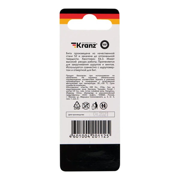 Универсальная удлиненная бита Torx торговой марки Kranz предназначена для винтов Torx размера TX 27. Такой вид насадки имеет форму звезды, ее конструктивная особенность позволяет улучшить сцепляемость с поверхностью крепежного изделия и снизить вероятность соскальзывания приспособления, так как нагрузка распределяется сразу на 6 граней. Бита изготовлена из высококачественной стали и обладает необходимым значением твердости и прочности. Ее длина составляет 50 мм, Насадка имеет универсальное применение и подходит для использования с шуруповертами и отвертками. Ее привод соответствует шестиграннику 1/4 дюйма. Насадка закалена до вязкой твердости, это препятствует преждевременному разрушению ведомого наконечника. Она идеально подходит для тяжелых случаев завинчивания и применяется в машиностроительной области и в производстве бытовой техники для закручивания крепежных элементов с соответствующей формой головки.