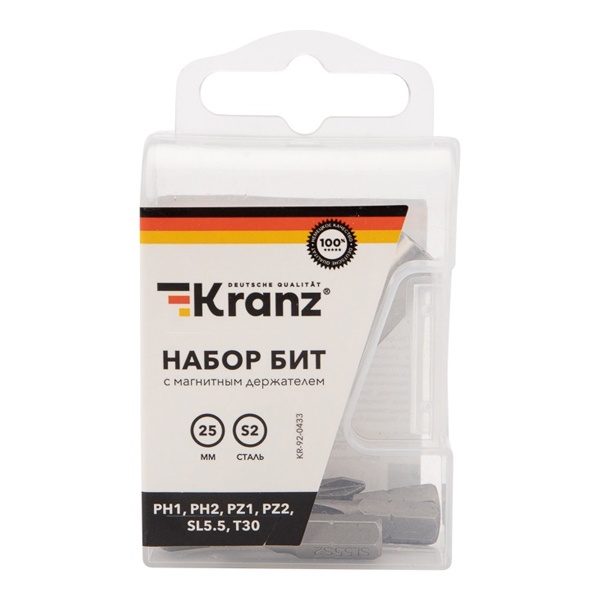 • Набор бит Kranz 25 мм PH1, PH2, PZ1, PZ2, SL5.5, T30 с магнитным держателем (7 шт./уп.)