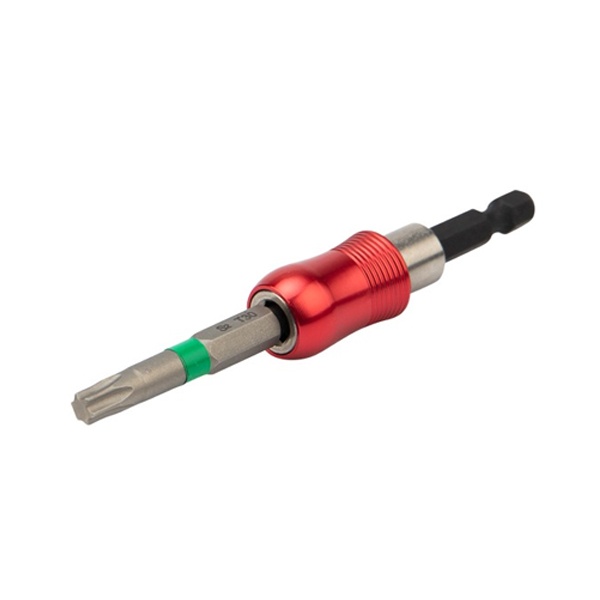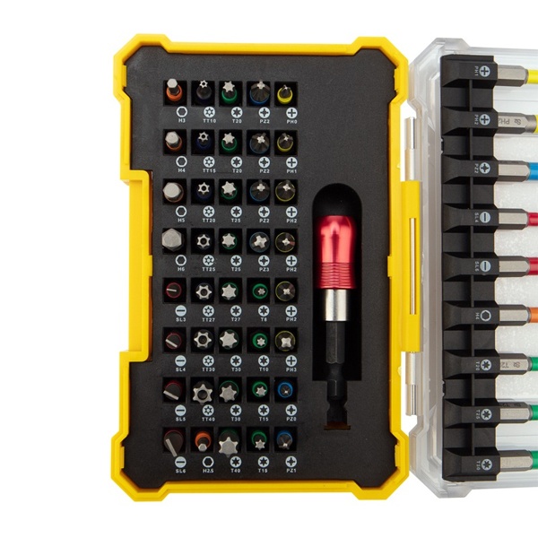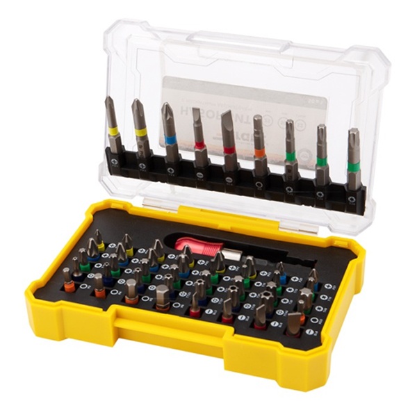 - 40 односторонних бит длиной 25 мм с различными типами шлица: PH0, PH1, PH2х3, PH3, PZ0, PZ1, PZ2х3, PZ3, H2.5, H3. H4, H5, H6, SL3, SL4, SL5, SL6, T8, T10, T15x2, T20x2, T25x2, T27, T30x2, T40, TT10, TT15, TT20, TT25, TT27, TT30, TT40;