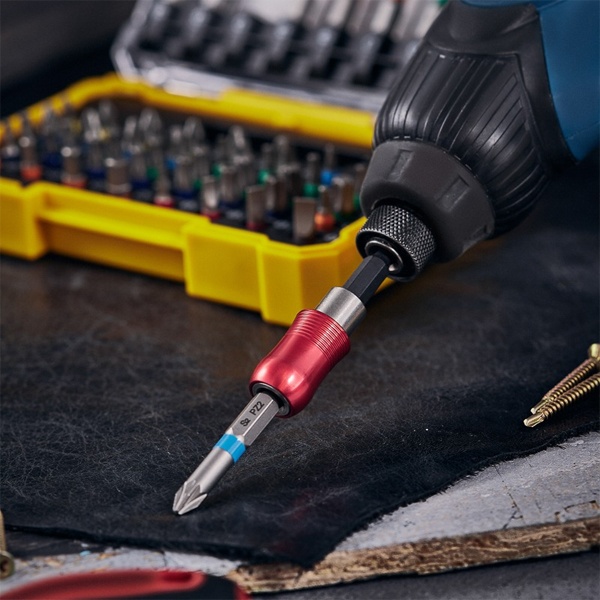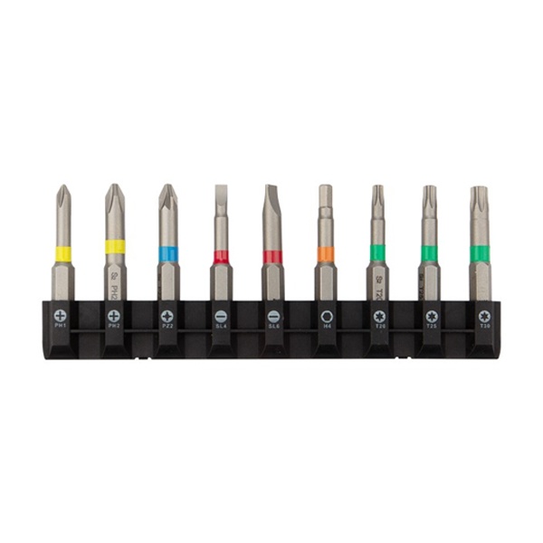 - 9 односторонних бит длиной 50 мм с различными типами шлица: PH1, PH2, PZ2, H4, SL4, SL6, T20, T25, T30;
