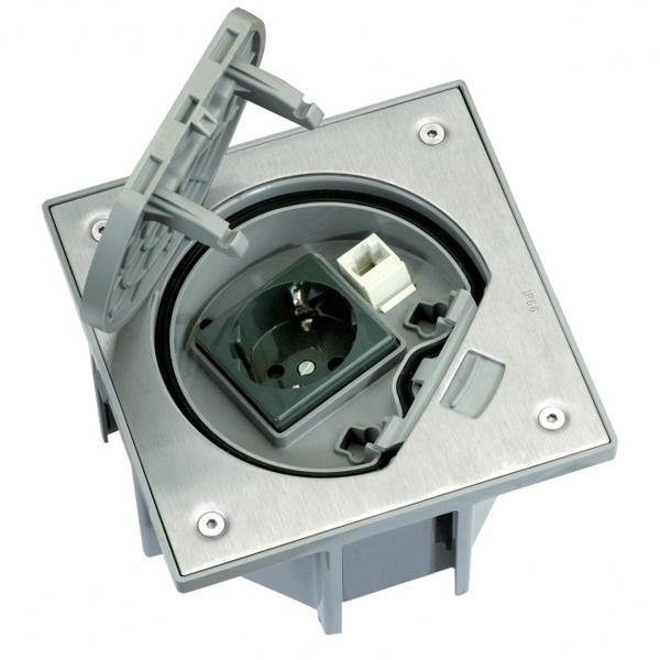 Напольный мини-лючок с клавишей влагостойкий с розеткой 2к+з Schuko К45 и коннектором RJ45 категории 5e UTP Simon серии Connect со степенью защиты IP66 стального цвета. KSE15U-23-72