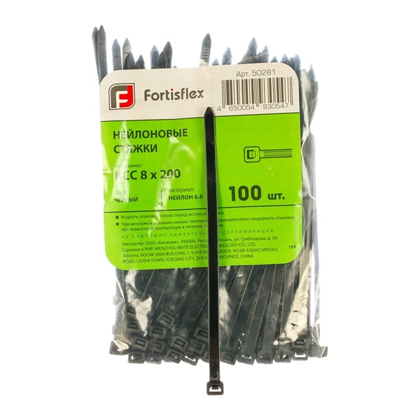 50281 Кабельная стяжка Fortisflex КСС стандартная 8х200 мм черная [упаковка 100шт]