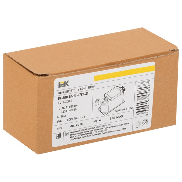Аппарат торговой марки IEK серии ВК-300 представляет собой концевой переключатель в металлическом корпусе, который предназначен для применения в электрических цепях управления, сигнализации и контроля относительного положения подвижных частей механизма в пространстве. Он рассчитан на нагрузку продолжительного тока 16 Ампер при максимальном напряжении электроцепи переменного тока для категории AC-11 – 230, 400 и 690 Вольт, а для категории DC-11 цепи постоянного тока – 110, 220 и 400 Вольт.Контактор приводится в действие с помощью роликового рычага, обладающего функцией правого хода и самовозврата. Для ввода внешних проводов предназначен сальник МG 20, который входит в комплект. При его установке конструкция имеет высокую степень защиты IP67, предотвращает от попадания грязи и влаги и устойчива к негативному влиянию окружающей среды. Прибор оснащен 1 разомкнутым и 1 замкнутым типом контактов. Предельное сечение присоединяемых кабелей составляет 2х1,5 квмм и 1х2,5 кммм. Устройство выдерживает до 600 включений и отключений в час и обладает механической износостойкостью до 1 млн циклов. Продолжительный срок службы составляет не менее 10 лет.Концевой выключатель имеет следующие размеры:ширина – 6 см;высота – 7,1 см;длина – 12,2 см.Он используется для лифтов, строительных кранов, конвейеров, для устройств с автоматическим приводом и прочего оборудования промышленного назначения.
