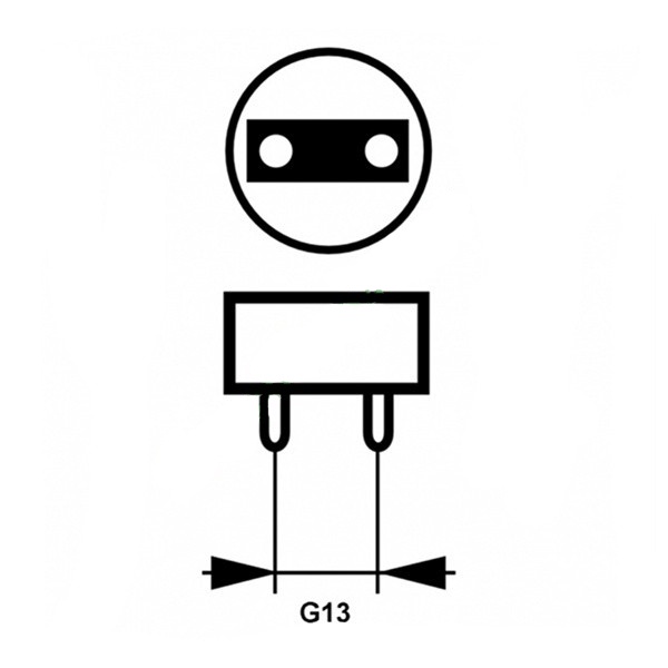 Добрый день, Ольга.В этой лампе используется цоколь G13, который находится с двух сторон лампы.По другому говоря - 2 цоколя G13. Где 13 - это расстояние между штырьками 13мм.
