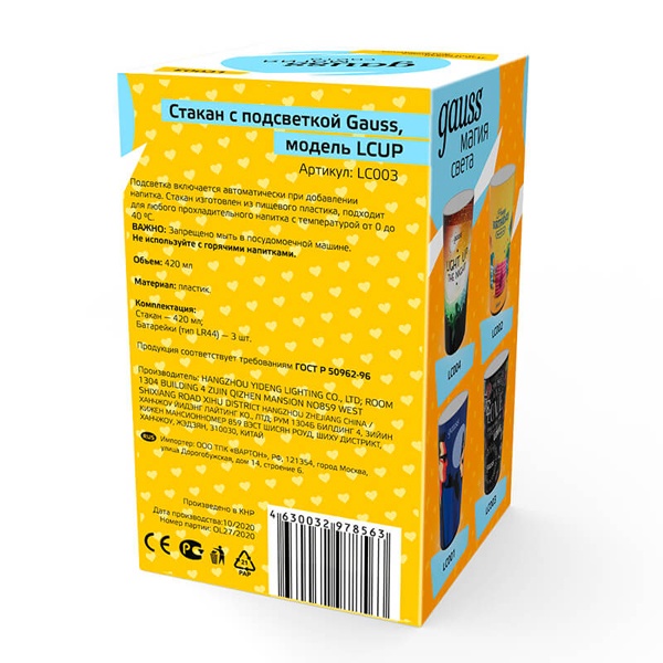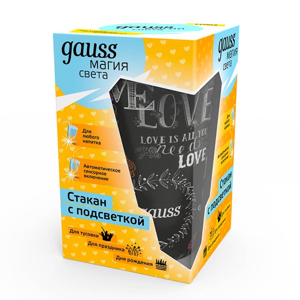 Стакан с подсветкой Gauss модели LCUP предназначен для бытового использования с любыми прохладительныминапитками температурой от 0 °С до 40 °С. Идеально подойдет для подарка и яркого аксессуара на любой праздник. Подсветка включается автоматически при добавлении в стакан любого прохладительного напитка.