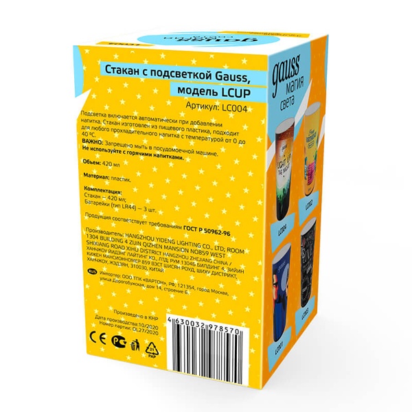Стакан с подсветкой Gauss модели LCUP предназначен для бытового использования с любыми прохладительныминапитками температурой от 0 °С до 40 °С. Идеально подойдет для подарка и яркого аксессуара на любой праздник. Подсветка включается автоматически при добавлении в стакан любого прохладительного напитка.