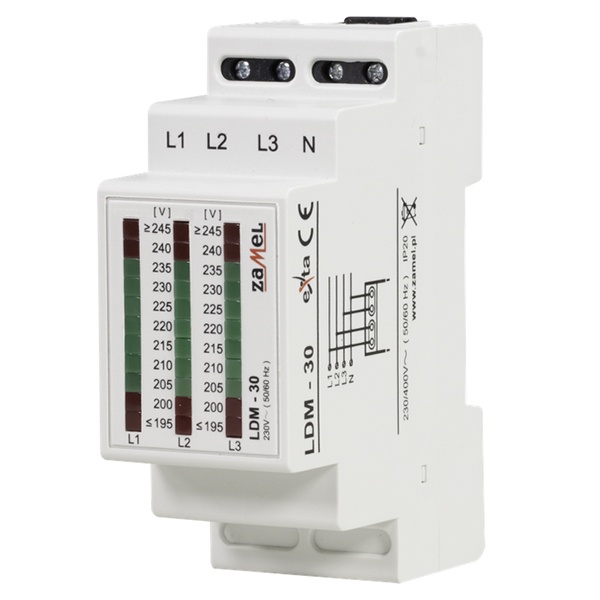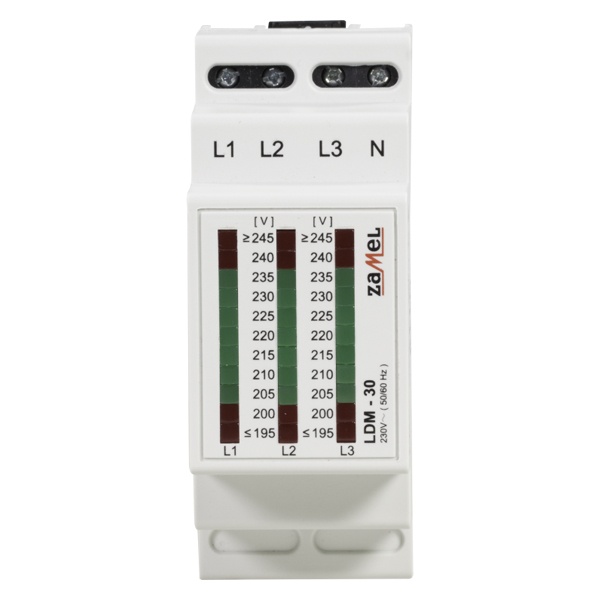 Индикатор напряжения LDM 30 предназначен для графической индикации уровня фазных напряжений в трехфазной сети. Значение напряжения отображается с помощью трех светодиодных столбцов, состоящих из 11 светодиодов каждый. Диапазон показаний составляет от 195 до 245 В ~.