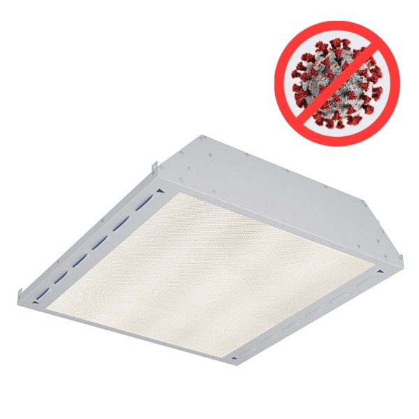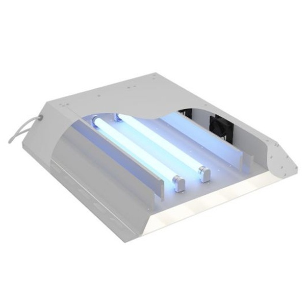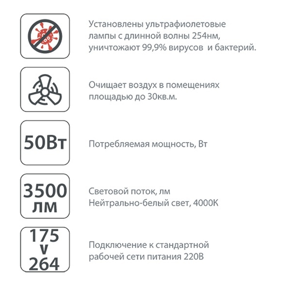 В светильнике установлен изолированный блок обеззараживания воздуха на две УФ-лампы по 8 Ватт каждая.