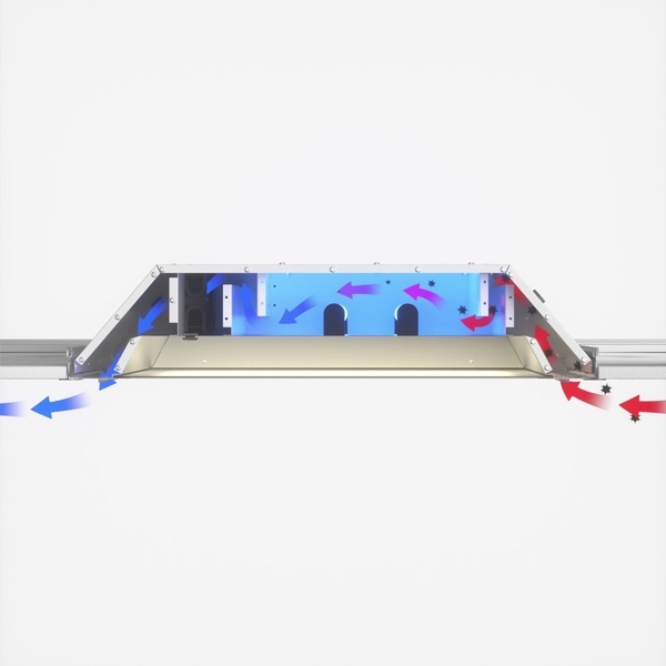 Воздух из помещения прокачивается через рециркуляционный модуль обеззараживания светильников благодаря установленным внутри бесшумным вентиляторам. Система прокачки воздуха через светильники устроена таким образом, чтобы потоки не смешивались, сопла светильника направлены в разные стороны, за счет такого расположения достигается оптимальная циркуляция воздуха в пространстве под светильником, позволяющая постоянно поддерживать чистоту воздушной атмосферы в помещении.