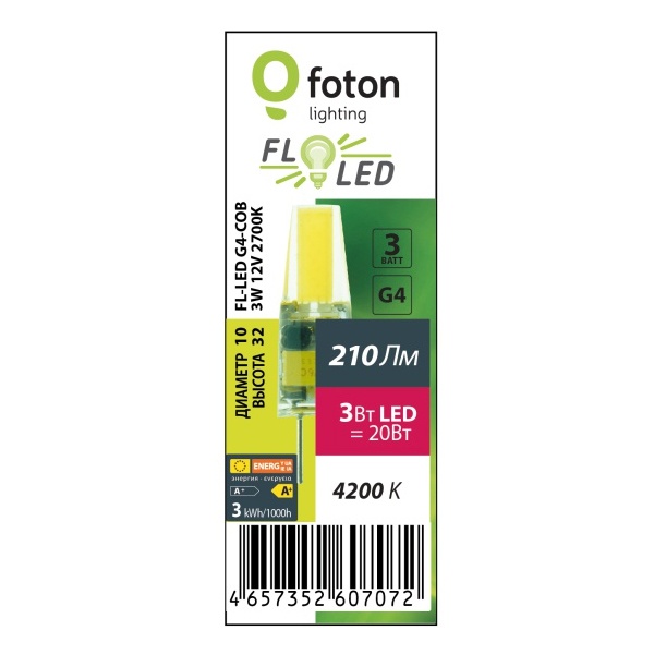 Светодиодная лампа FL-LED G4-COB 3Вт 4200К 12В 210лм 10x38мм белый свет Foton lighting 607072