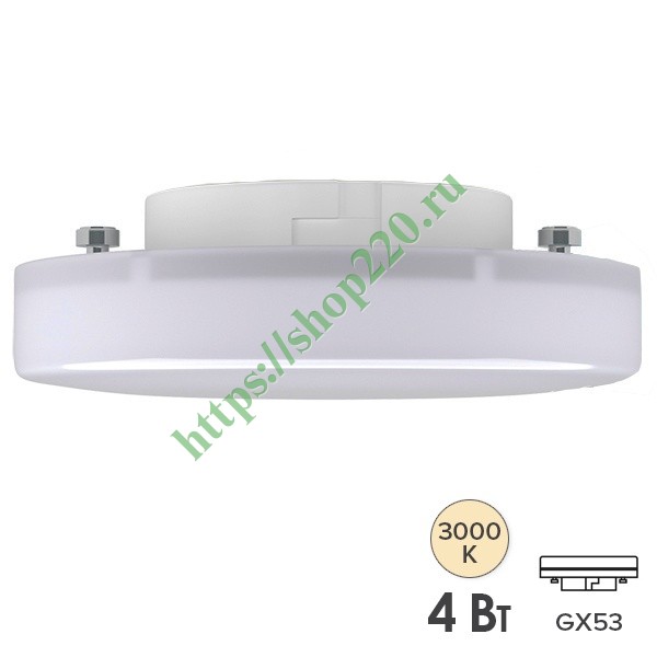 Лампа светодиодная GX53 - это источник света на основе технологии светодиодов (LED). Она представляет собой плоский круглую лампу с цоколем GX53, который обеспечивает высокую яркость и эффективность, используя значительно меньше энергии, чем обычные лампы накаливания.