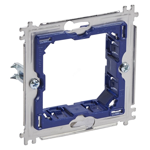 Пластиковый суппорт с металлическим основанием на 2 модуля с креплением в монтажной коробке на распорные лапки, крепежная рамка выполнена с возможностью объединения в блок на несколько постов по горизонтали и вертикали, имеет размер: 72*72 мм