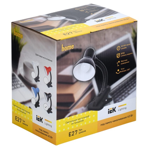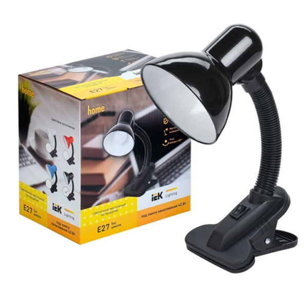 Настольный осветительный прибор с креплением прищепка ИЭК с патроном E27, с регулировкой наклона и поворота плафона, черного цвета LNNL1-1001-2-VV-40-K02