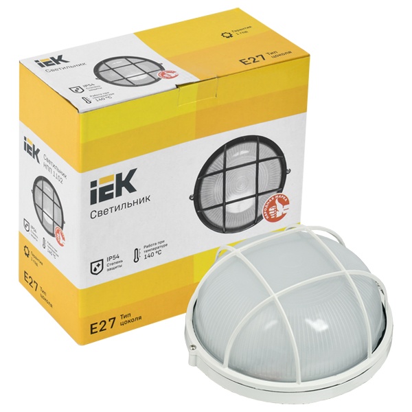 Влагозащищенный круглый белый светильник решеткой ИЭК на 100 Ватт под лампу с цоколем E27 со степенью защиты IP54Влагозащищенные светильники имеют особую конструкцию, препятствующую проникновению к осветительному элементу воды и пара. Предназначены для использования в бассейнах, душевых и на промышленных производствах. Плафон защищает лампу не только от влаги, но и от пыли.