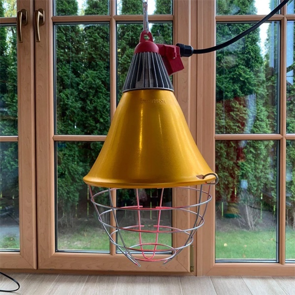 Изготовлен из алюминия золотистого цвета и негорючего пластика. Оснащен переключателем Hi-off-lo, что позволяет снизить мощность лампы для экономии электроэнергии. Металлическая сетка предохраняет животных от повреждений при случайном соприкосновении с рефлектором.