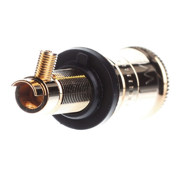 Разъём для профессионального подключения высококачественных акустических систем. Кабельные гнёзда (вилка 6 мм и 8 мм) или витые кабели (6 мм2) подсоединяются запатентованной зажимной гайкой. Корпус терминала изготовлен одной деталью, чтобы получить наименьшее сопротивление.