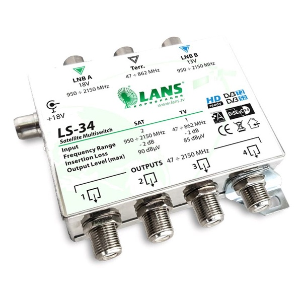 Мультисвитч Lans 3 х 4 (артикул производителя: LS 34) — активный распределительный узел для построения системы спутникового и эфирного телевидения в квартире, частном доме или небольшом объекте. Устройство принимает сигнал с двух SAT-линий (обычно от конвертера/свитча) и одной линии эфирного ТВ, после чего раздает его на 4 независимых абонентских выхода. Питание осуществляется от внешнего блока питания, что обеспечивает стабильную работу и компенсацию потерь в кабеле на распределении.