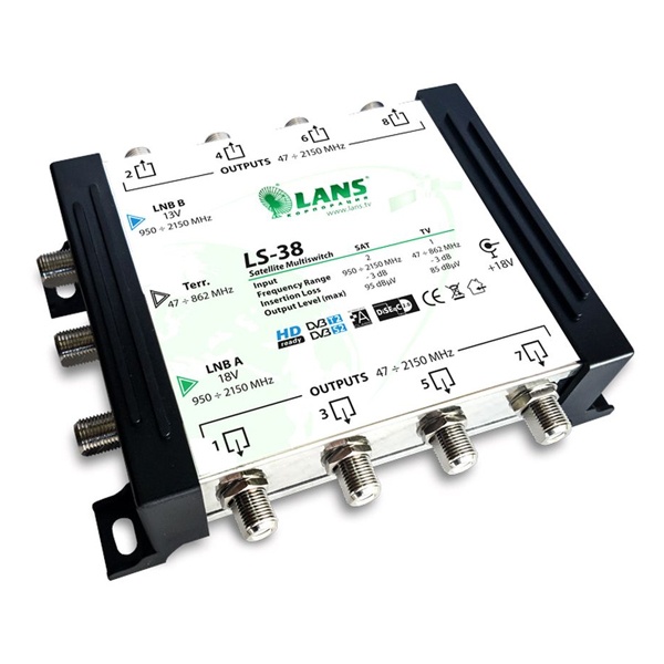 LS 38 Мультисвитч Lans 3 х 8 3 входа (2 SAT + 1 TV), 8 выходов, активный, с внешним блоком питания