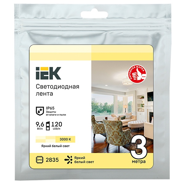 Лента светодиодная, влагозащищенная LSR2835, мощностью 9,6 Ватт на метр, теплый белый свет, длиной 3 метра LSR1-1-120-65-3-03
