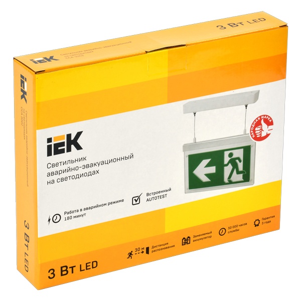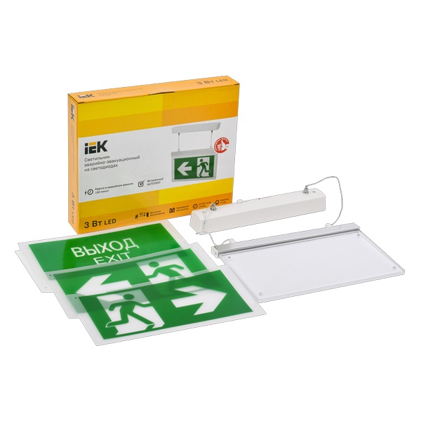 Двусторонний эвакуационный светильник с возможностью смены знака.Три сменных знака в комплекте: выход, выход налево, выход направо.Дистанция распознавания знака свыше 30 метров.Средняя яркость знака - не менее 200 кд/м2.Характеристики:- Мощность лампы - 3.0 Вт