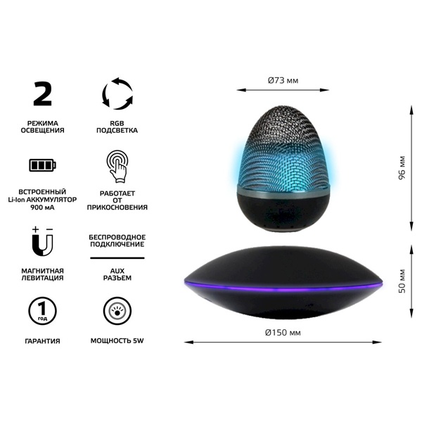 Светильник и беспроводная колонка Gauss снабжены источником магнитного поля, который находится в подставке устройств и при этом осуществляется беспроводная передача энергии для работы светильника и колонки.