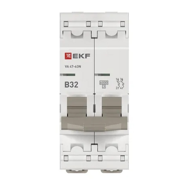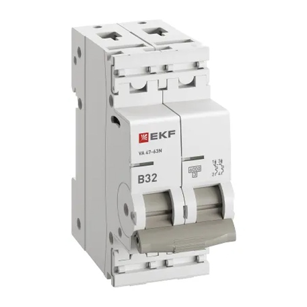 Двухполюсный электрический автомат на дин рейку ЕКФ ВА47-63N ток нагрузки 32А с уставкой B, отключающая способность 6кА M636232B
