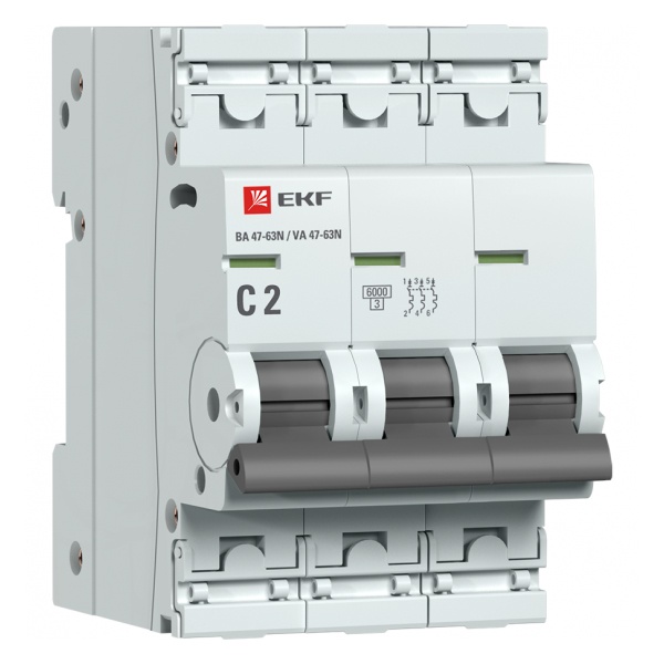 Модульный трехполюсный электрический автомат ЕКФ ВА47-63N номинальный ток 2А с уставкой С, коммутационная способность 6кА M636302C