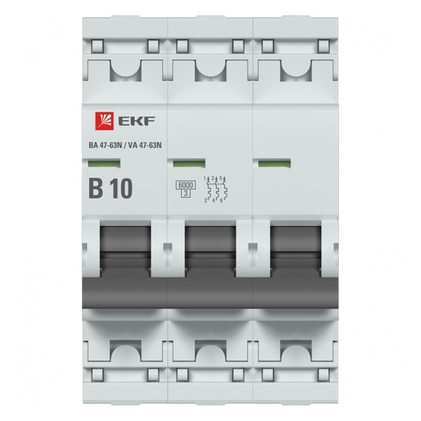 Трехполюсный электрический автомат на дин рейку ЕКФ ВА47-63N ток нагрузки 10А с уставкой B, отключающая способность 6кА M636310B
