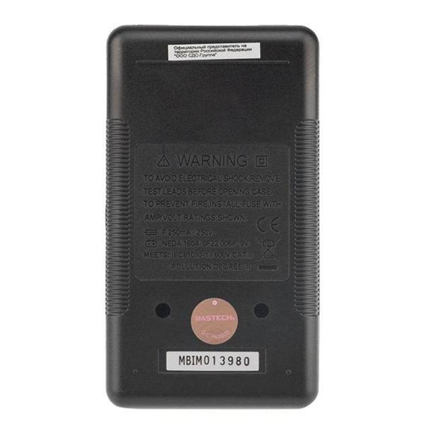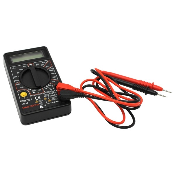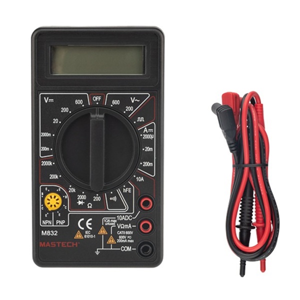 Цифровой мультиметр Mastech M832 производит измерения величины постоянного и переменного напряжения, силы постоянного и переменного тока, сопротивления и коэффициент усиления биполярных транзисторов (h21). Встроенный генератор 50 Гц будет полезен при испытании радиотехнических устройств. Так же с помощью мультиметра M832 можно прозвонить полупроводниковые диоды. Качество соединения проводников или пайки можно проверить с помощью звуковой прозвонки. Результаты измерений выводятся на хорошо читаемый цифровой 31/2 -разрядный ЖК-дисплей. Питание мультиметра осуществляется от одной батареи 9В типа "Крона". В комплекте поставки мультиметра Mastech M832 входит комплект щупов и инструкция на русском языке.