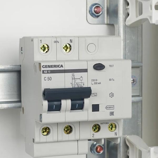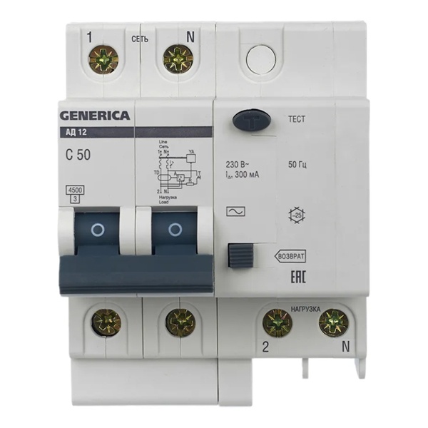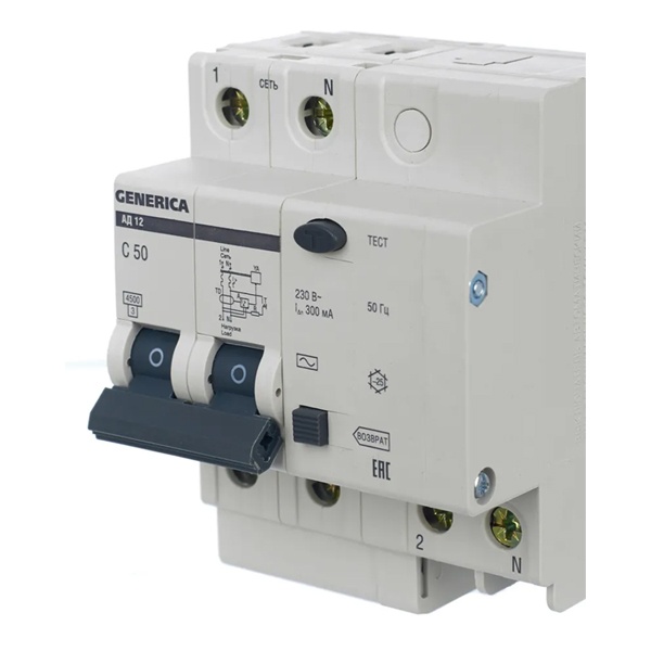 Дифференциальный автоматический выключатель класса АС серии GENERICA от производителя ИЭК представляет собой устройство со встроенной защитой от сверхтоков, которое используется в однофазных электросетях переменного тока с частотой 50 Герц и напряжением до 230 Вольт. Агрегат выполняет защитную функцию и обеспечивает 3 типа защиты: от короткого замыкания, перегрузок и возникновения утечки тока. Принцип действия: обнаружение дифференциального тока, сравнение с током срабатывания и отключение защищаемой цепи при превышении заданного значения. Данная модель рассчитана на токовую нагрузку 50 Ампер и обладает чувствительностью в 300 милиампер. Она создана для предотвращения причин возникновения пожаров из-за нарушений в электропроводке. Дифавтомат обладает высокой отключающей способностью в 4500 Ампера и уставкой типа C. Компактный прибор с 2-мя защищенными полюсами 2Р крепится на DIN-рейку. На лицевой части есть тестовая кнопка для периодической проверки работоспособности дифавтомата, а также рукоятка управления с 2-мя позициями и кнопкой «Возврат», служащей индикатором срабатывания по дифференциальному току. Аппарат класса АС защищает только от синусоидальных переменных токов утечки и применяется для типовых нагрузок. Областью применения выступают распределительные щиты и силовые установки на объектах гражданского строительства. Габаритные параметры: ширина – 71,5 мм, высота – 87 мм, глубина – 78 мм.