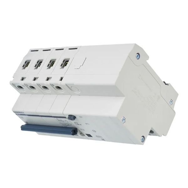 Дифференциальный автомат класса АС серии Generica производства ИЭК представляет собой компактное устройство со встроенной защитой от сверхтоков. Оно применимо в трехфазных электросетях переменного тока с частотой 50 Герц и напряжением до 230/415 Вольт. Дифференциальный автоматический выключатель АД14 выполняет функцию обнаружения дифференциального тока, сравнивает его со значением тока срабатывания и отключает защищаемую цепь, если дифференциальный ток превышает это значение. Также с помощью данного агрегата осуществляется автоотключение установки при возникновении КЗ и перегрузок. Дифавтомат защищает человека от поражения током при непосредственном касании. Данная модель рассчитана на номинальную нагрузку тока 50 Ампер при допустимом значении тока утечки – 30 милиампер. Она обладает отключающей способностью в 4500 Ампера и характеризуется уставкой типа C. Модульное устройство имеет 4 защищенных полюса 4P и монтируется на дин-рейку простым защелкиванием. Оно оснащено удобным рычагом управления с индикацией срабатывания по току утечки, току короткого замыкания и в случае перегрузки. Кнопка «Тест» позволяет следить за работоспособностью устройства. Размеры: ширина – 134,2 мм, высота – 87 мм, глубина – 78 мм.