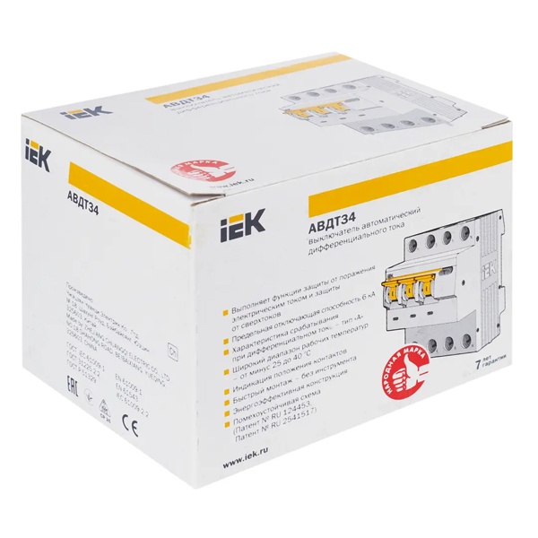 Автоматические выключатели дифференциального тока АВДТ34 предназначены для защиты человека от поражения электрическим током при повреждении изоляции электроустановок, для предотвращения пожаров вследствие протекания токов утечки на землю и для защиты от перегрузки и короткого замыкания в сетях переменного тока напряжением 400 В и частотой 50 Гц.