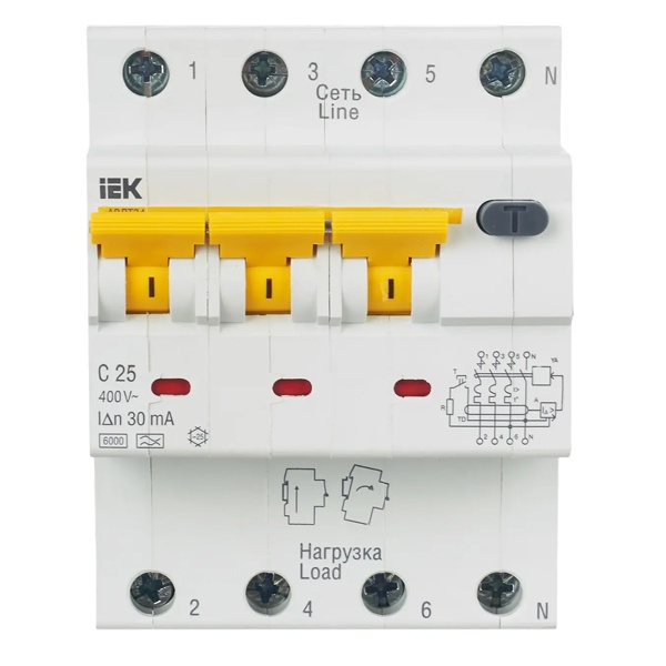 • Дифференциальный автомат ИЭК АВДТ34 C25А 3П+Н 30мА тип А трехфазный электронный 6кА (дифавтомат, АВДТ)