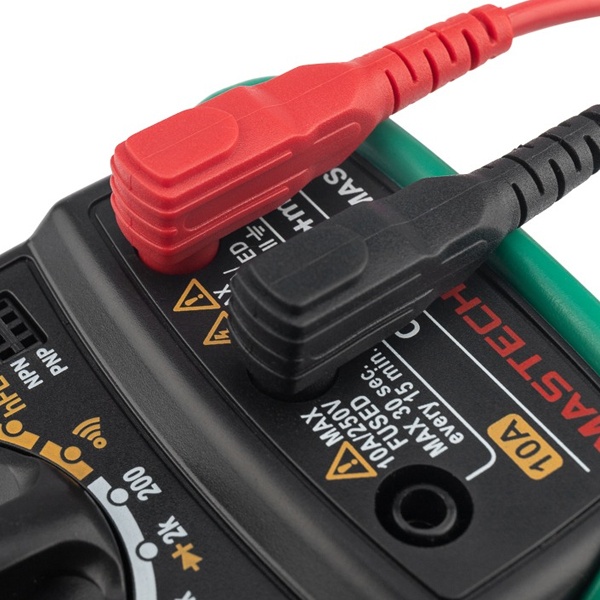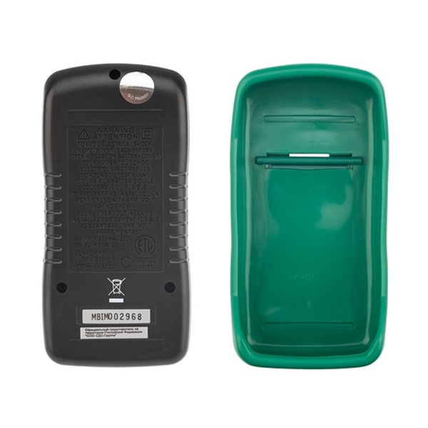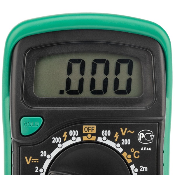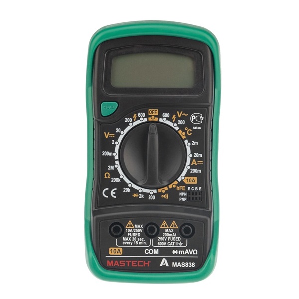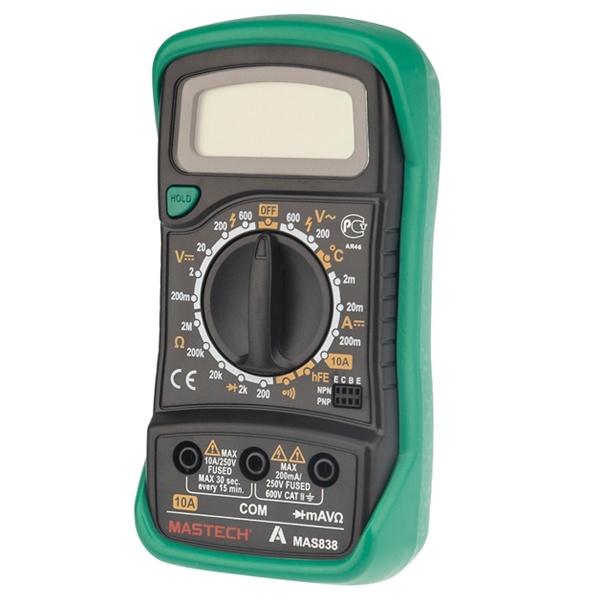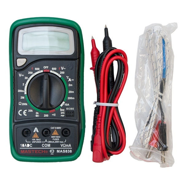 Цифровой мультиметр Mastech MAS838 производит измерения силы постоянного и переменного тока, величины постоянного и переменного напряжения, сопротивления, температуры окружающей среды и коэффициент усиления биполярных транзисторов (h21). Так же с помощью мультиметра MAS838 можно прозванивать полупроводниковые диоды. Результаты измерений выводятся на цифровой 31/2-разрядный ЖК-дисплей. Результат измерений можно зафиксировать с помощью функции "HOLD". Мягкий полимерный защитный кожух, входящий в комплект поставки, снизит вероятность повреждения мультиметра при падении или неаккуратном использовании. Питание мультиметра осуществляется от одной батареи 9 Вольт типа "Крона". В комплекте поставки мультиметра Mastech MAS838 входит полимерный защитный кожух комплект щупов, термопара для измерения температуры и инструкция на русском языке.