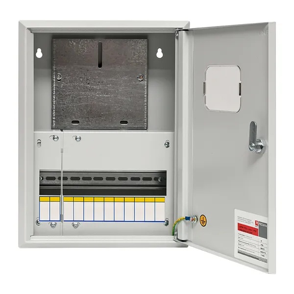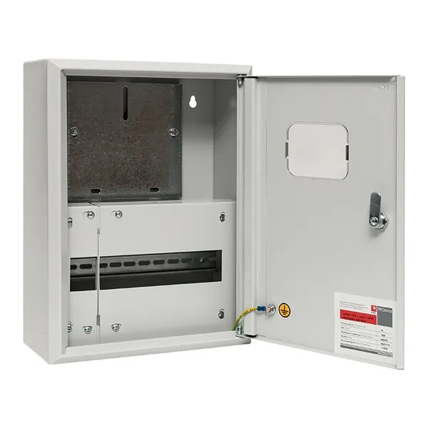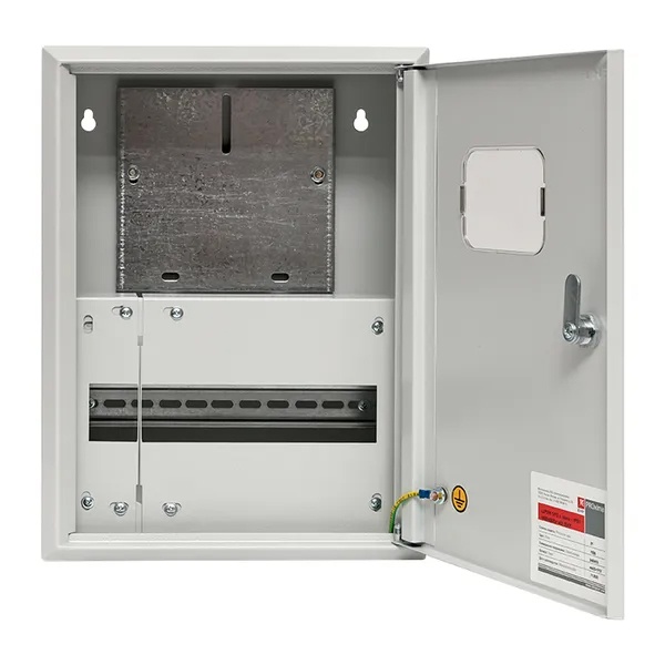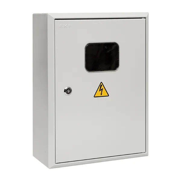 Сварной корпус ЩУРн от производителя EKF относится к серии учетно-распределительных шкафов PROxima и представляет собой компактный бокс из металла, который предназначен для установки устройств модульного типа и электрических счетчиков. С его помощью осуществляется ввод, учет и распределение энергии, а также защита сети от перегрузок тока и коротких замыканий. Данная модель шкафа сделана из стали толщиной 0.8 мм, которая обеспечивает степень защиты IP31 от попадания твердых объектов и вертикально падающих капель. Она имеет покрытие светло-серого цвета RAL 7035 в виде атмосферостойкой порошковой краски. Модульная аппаратура с номинальной величиной тока до 125 Ампер крепится на DIN-рейку в количестве 12 модулей, а электросчетчик фиксируется на монтажной панели из оцинкованной стали толщиной 1.2 мм размером 170х183 мм. Показания счетчика снимаются через прозрачное окно, расположенное в двери.