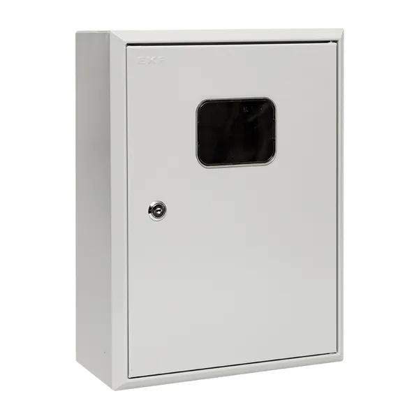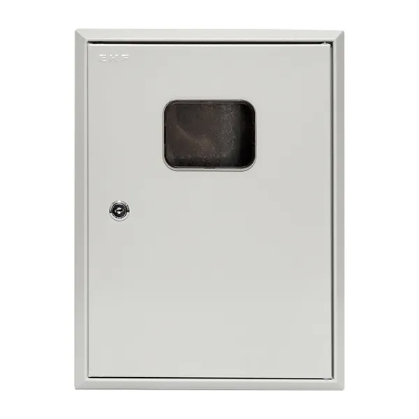Учетно-распределительный шкаф ЩУРн серии PROxima от известного производителя EKF представляет собой навесной корпус в металлической оболочке, предназначенный для ввода, учета и дальнейшего распределения электроэнергии. Внутреннее пространство рассчитано на установку одного электросчетчика на монтажной панели размером 170х183 мм и модульного оборудования на DIN-рейке в количестве 9 модулей. Номинальная величина тока встраиваемых приборов составляет 125 Ампер при напряжении сети 230-400 Вольт. Оболочка электрощита выполнена методом сварки из листовой стали толщиной 0.8 мм и обеспечивает жесткость и герметичное соединение частей. Степень защиты IP31 предотвращает попадание твердых объектов и вертикально падающих капель внутрь корпуса. Для обеспечения дополнительной защиты шкаф оснащен сплошной дверью с углом открывания 120 градусов, запирающейся на почтовый замок и имеющей смотровое окно для снятия показаний счетчика.
